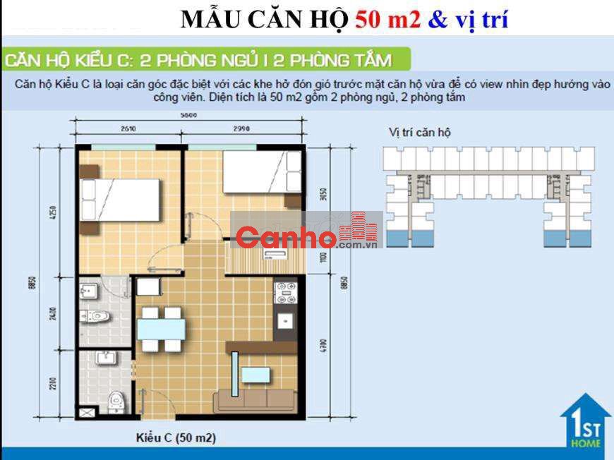 - Căn diện tích: 50m2 2pn,2wc 1 phòng khách, lô gia phơi đồ, view thoáng mát