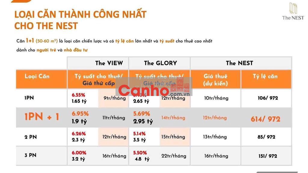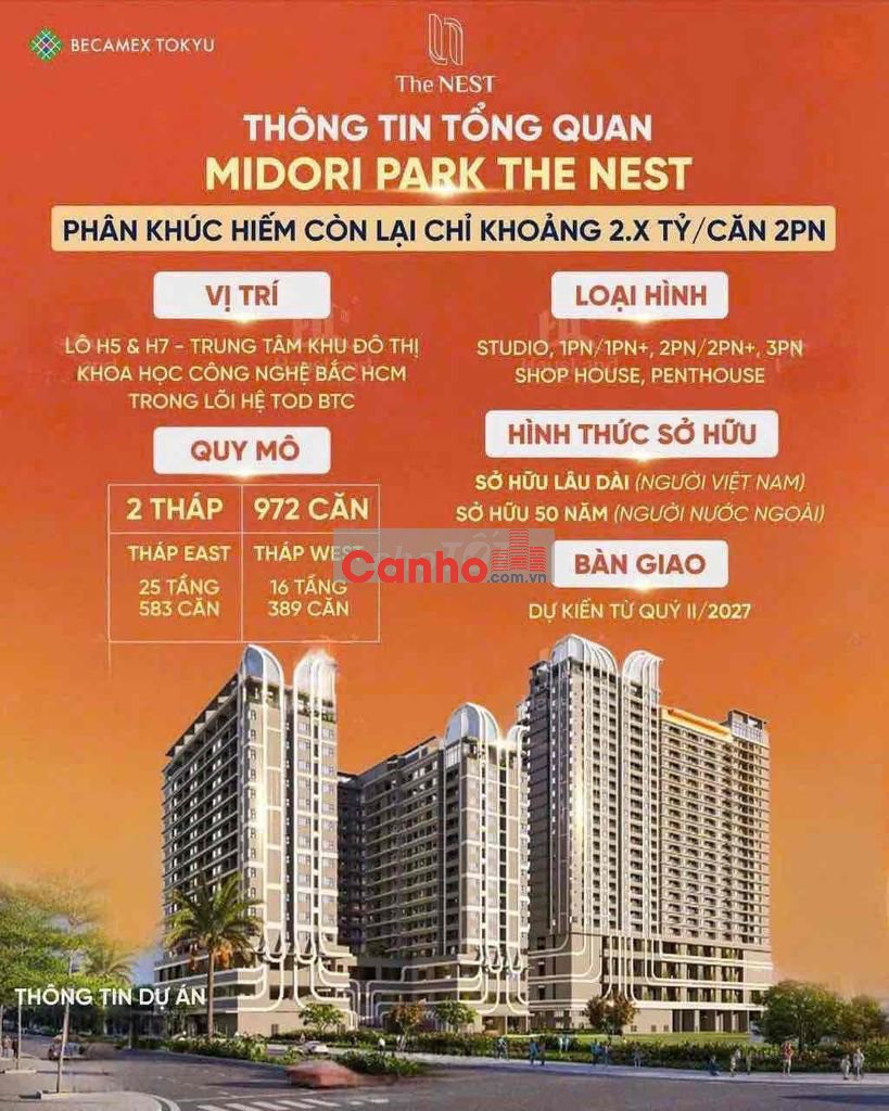 Quy mô dự án the nest của chủ đầu tư Becamex tokyu thành phố mới khoảng 972 căn bao gồm studio, 1pn, 1pn+ 1, 2pn, 3pn