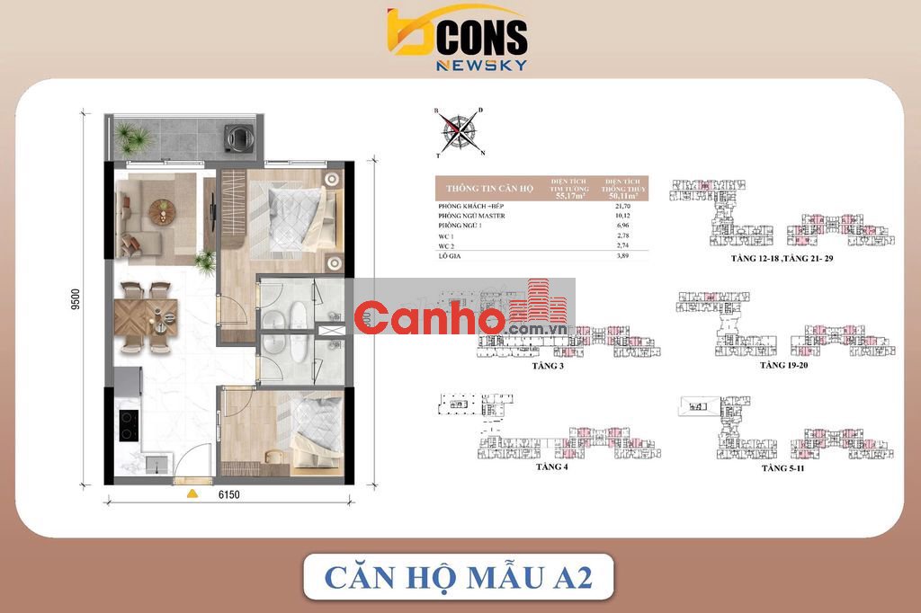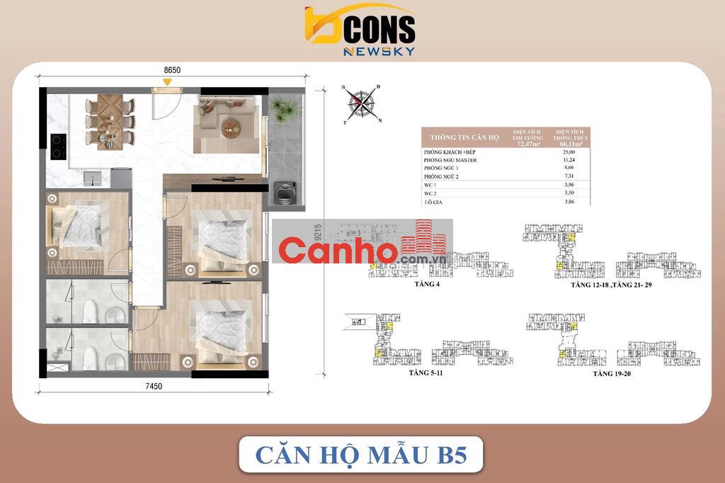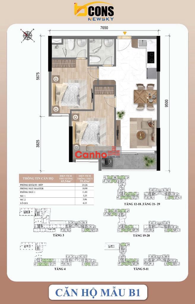 BÁN CĂN HỘ 65m2, 2PN2WC giá 3 tỷ 053. BCONS NEWSKY