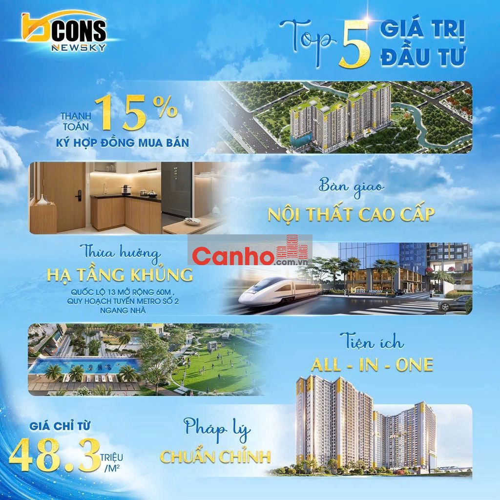 Bcons NewSky có lợi thế rõ rệt nhờ QL13 mở rộng + Metro số 2 + kết nối TP. HCM chỉ 20 phút. Tiềm năng tăng giá bền vững phù hợp đầu tư trung dài hạn và khai thác cho thuê.