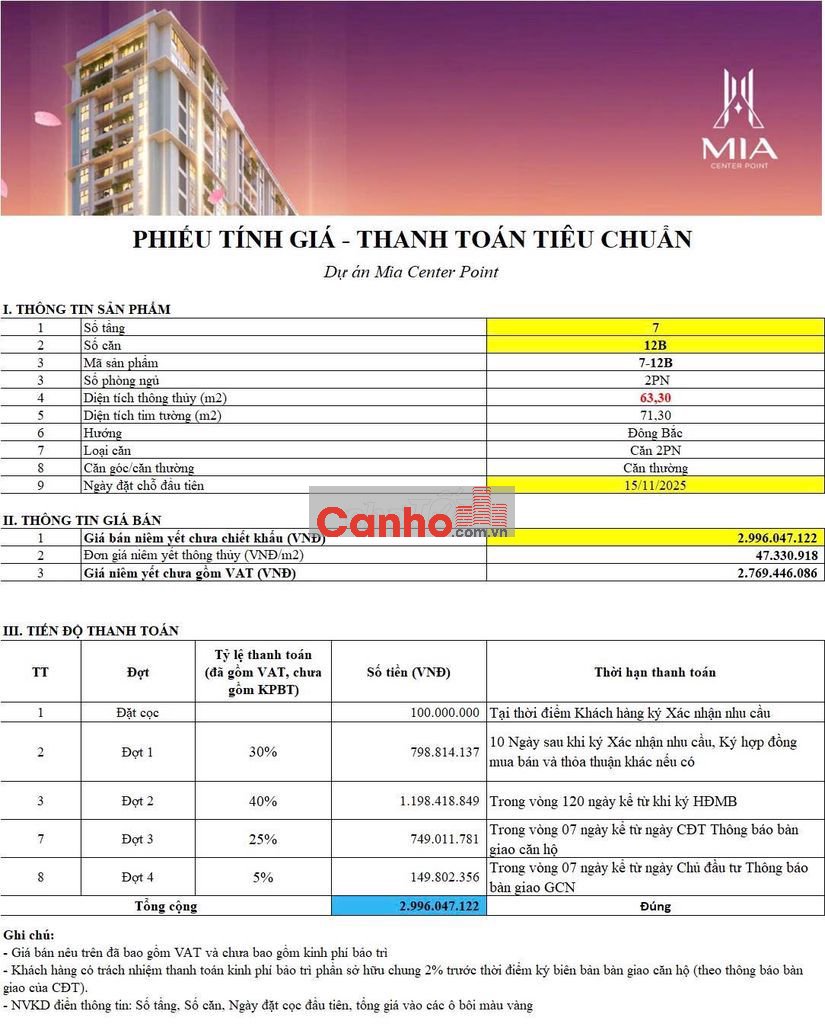 - Giá chưa chiết khấu bao gồm VAT: 2.9 tỉ. Cho căn 2 PN.