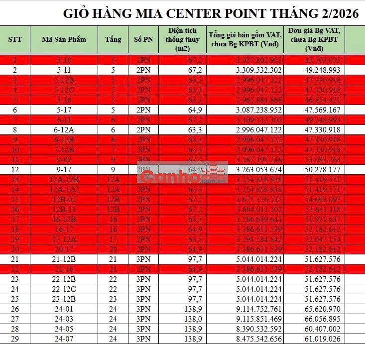 Giỏ hàng Mia center point đang vơi dần vào giai đoạn cuối của dự án, Giá cực kì rẻ cho căn 2Pn, diện tích từ 63,3m2 trở lên nằm ngay vị trí trung tâm sầm uất nhất quận Liên Chiểu.