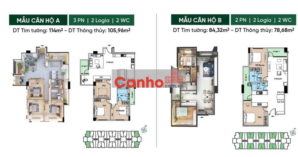Diện tích rộng rãi 84m2, 85m2, 89m2 - 2PN2WC| 114m2 - 3PN2WC