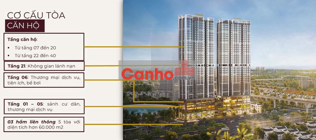 - Quy mô 5 tòa tháp cao 38 tới 40 tầng, 3 tầng hầm liên thông với tổng diện tích ~60.000 m².