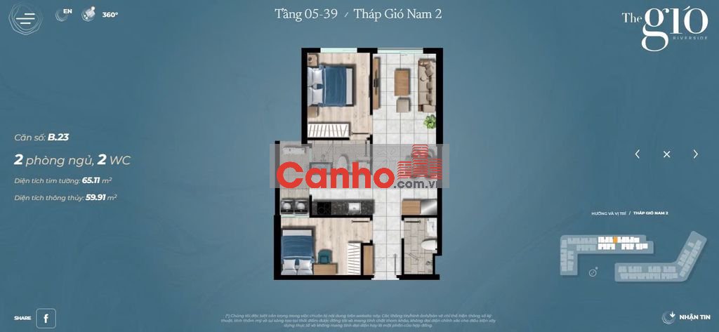 Chính chủ bán The Gió view sông 2pn chưa tới 48tr/m2 tất cả thuế phí.