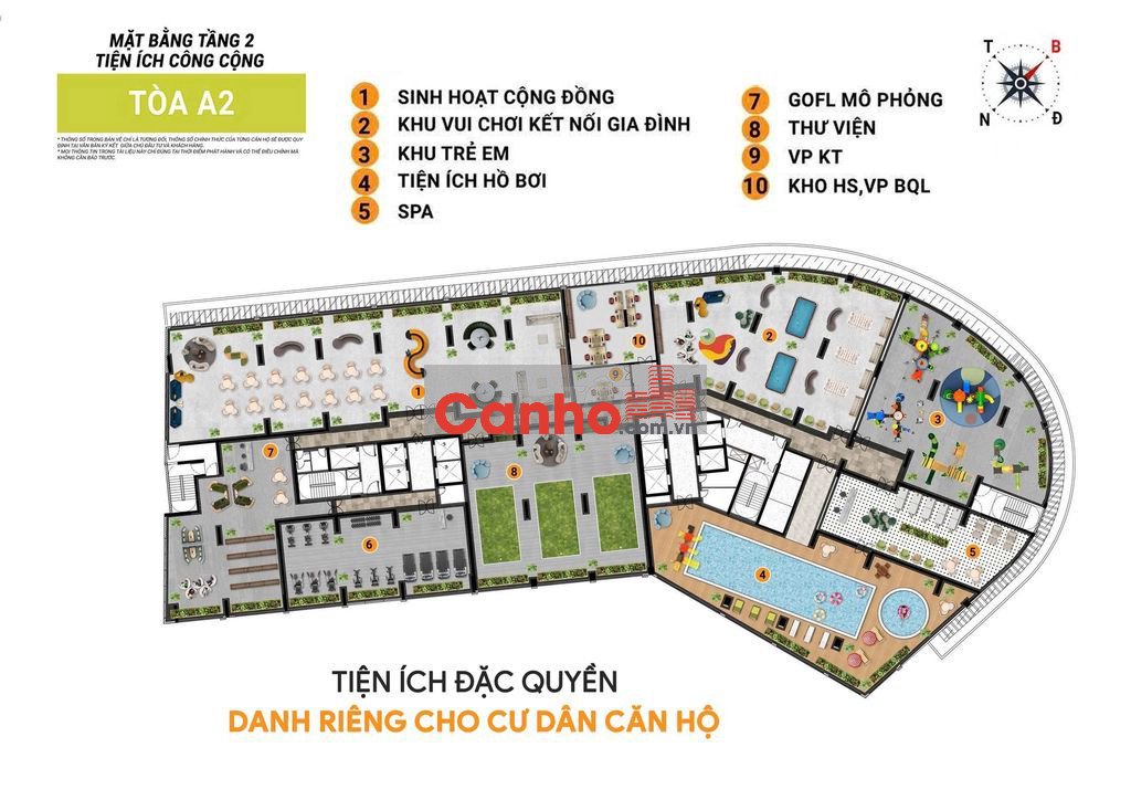 • Tầng 2: Tiện ích nội khu chuẩn cao cấp: gym, spa, sauna, kid club, hồ bơi, cà phê, thư viện, golf mô phỏng,… tiện ích danh riêng cho cư dân căn hộ.